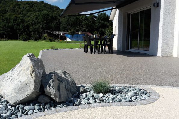 Il s’agit d’un produit super technique et je vais vous faire grâce de tous les termes, car seul le résultat compte après tout ! En résumé, Hydro’Way® est un revêtement totalement perméable qui s’utilise aussi bien sur des voies carrossables, piétonnes ou des toits-terrasses. L’eau ne reste donc pas sur le sol. Quand il neige, un système de chauffe intégré permet de faire fondre la couche, l’eau s’écoule vers la fondation non gélive. Le revêtement se compose de granulats naturels de différentes tailles. On peut l’utiliser aussi autour d’une piscine. Les granulats sont abrasés mécaniquement après la pose, la surface est donc toute lisse.