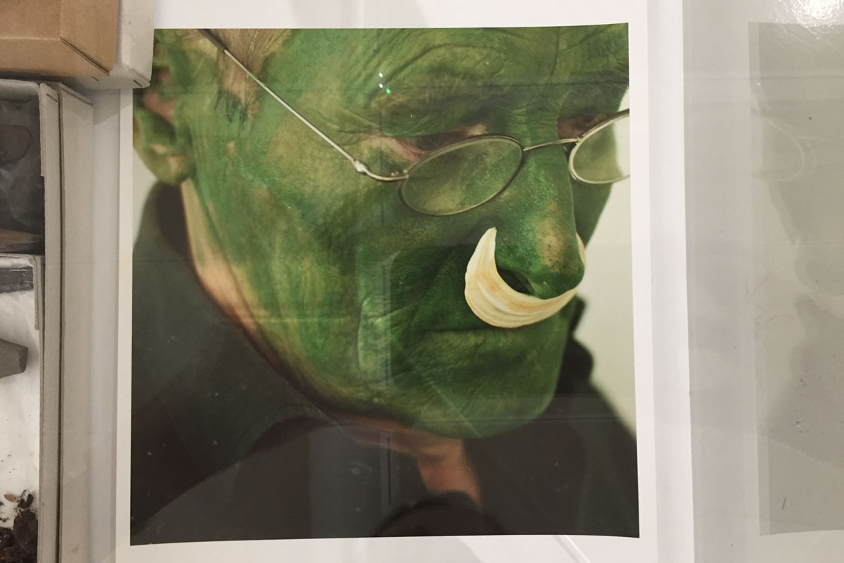 Voodoo fait maison“Plusieurs œuvres sont sur ce thème. D’une part des photos d’un happening avec une vesse–de-loup dont les spores laissent échapper leur poussière devant le visage d’un homme. Dans Voodoo fait maison V, on voit le saint esprit que les paysans suspendaient au-dessus de leurs lits : une pomme de terre avec des plumes de poule attachées avec un crin de cheval. On disait que tant que le crin, le lit et le sol bougeaient, les paysans étaient bien vivants et leur descendance était assurée…” |