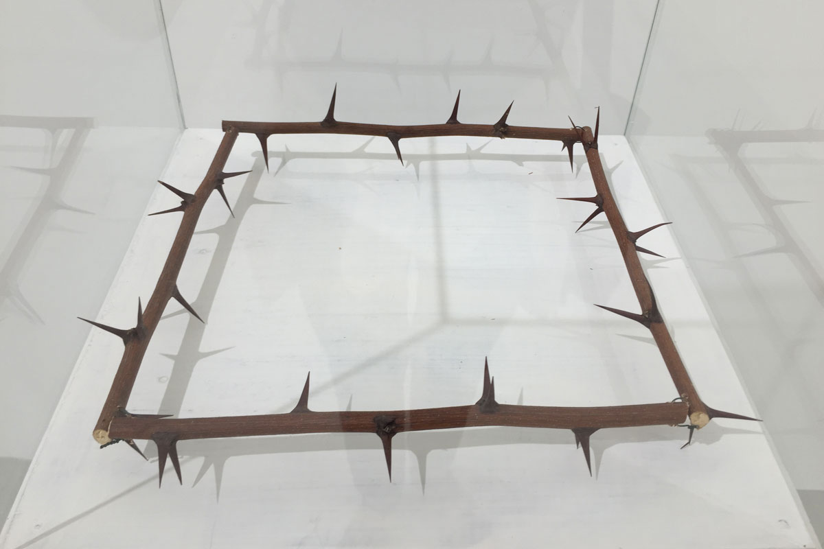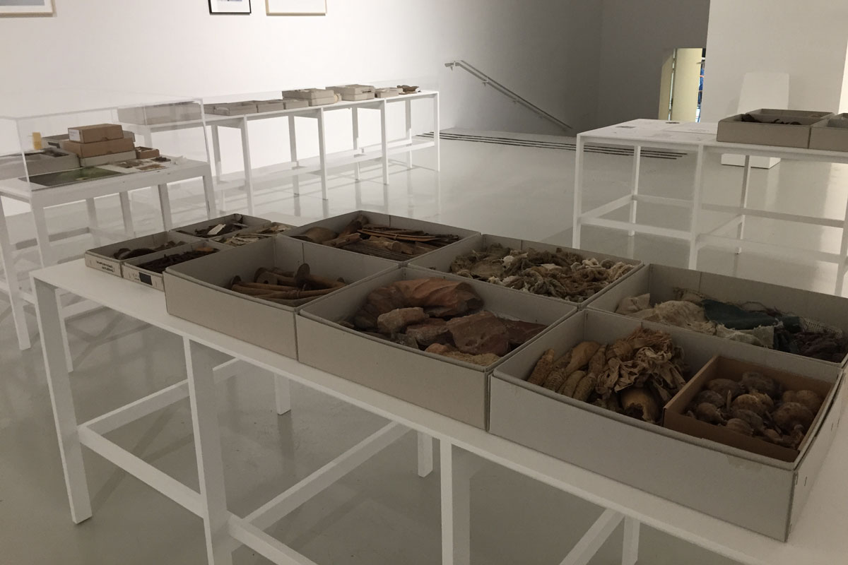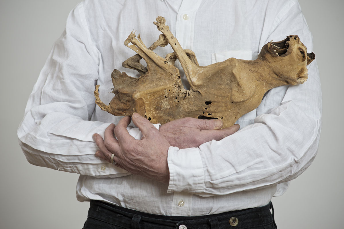 Champ de décombres (ensemble de vitrines et d’objets trouvés dans le sol de la ferme familiale)“J’ai exposé cette installation l’an dernier à la Documenta d’Athènes. En faisant des travaux dans la ferme familiale, je me suis rendu compte que son sous-sol était plein d’objets. Donc, un beau jour je me suis dit que j’allais ouvrir le plancher et sortir tout ce qu’il y avait en dessous. J’ai passé tout ça au tamis pendant 6 ans. Pour moi, c’est important d’exhumer les choses enfouies. Le jardin, c’est ce qui est en dessous, dans le sol : les racines, les graines, le lieu du possible où tout peut advenir. Sa valeur réside aussi dans sa prédisposition à faire émerger un sens. Beaucoup d’objets, ici, sont liés à la religion parce que cette ferme était celle d’un très grand monastère et elle logeait de nombreux pèlerins. On trouve des monnaies, des petites Vierges, des objets qui protègent du malheur, des éléments de la nature, une momie de chat dont on a cassé le cou pour faire un sacrifice lors de la construction de la maison. Ce mélange de rites païens et religieux, dans le monde rural, m’a intéressé, car il se perd aujourd’hui. Quand quelqu’un mourait, par exemple, on gardait une chaussure qu’on mettait au sous-sol ou dans les greniers en mémoire de la personne disparue; pas deux par peur qu’elle revienne !” |