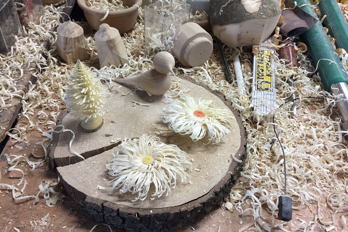 Gilles Galemiche est installé comme tourneur sur bois depuis 2007. Le regarder travailler est fascinant tant sa façon de creuser, ciseler et sculpter le bois paraît un jeu d’enfant. Qu’on ne s’y trompe, cet art demande une technique bien rodée qu’il peut vous enseigner. Ce magicien fabrique en quelques minutes des saladiers, des bols, des bilboquets, des sculptures, des lampes, des boules de Noël et une infinité d’objets utiles ou décoratifs, minuscules ou massifs. Les bois varient du noisetier vert au mirabellier en passant par le pommier, le frêne, le lilas ou le laurier.