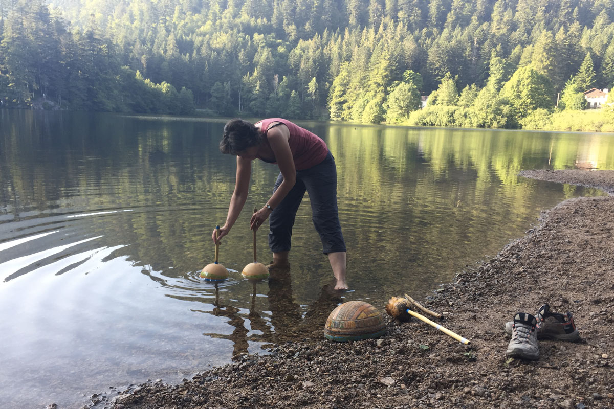 Hautboïste, musicothérapeute et passionnée par l’environnement, Sylvie Triboulot transforme tout ce qu’elle trouve dans la nature en musique! Ainsi du granit des Vosges ou de la pierre bleue de Belgique, elle fait des lithophones. Des renouées du Japon, quand elles se lignifient, elle récupère les tubes. Comme percuteurs, elle utilise des os, des mâchoires de sanglier, des bois de cerfs ou des cornes de chamois. Créant chaque jour de nouveaux sons, elle charmera vos oreilles lors d’une promenade, en agitant coquilles d’escargot et ongles d’Alpaga. Fait tourner des feuilles de houx pour imiter l’envol de l’oiseau. Et attire les canards du lac de Retournemer avec sa calebasse transformée en flûte aquatique… Qui dit mieux?