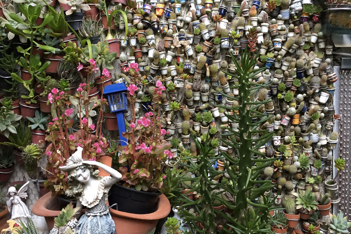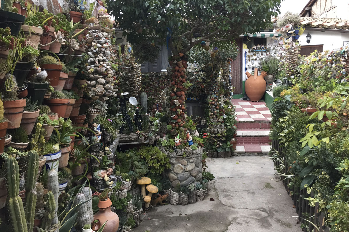 Lors d’un reportage en Estrémadure, en Espagne, nous avons poussé la porte, toujours ouverte, de la Maison des Cactus dans le petit village d’Hervas (vallée de l’Ambroz). Dans sa cour, des centaines de petites plantes grimpent le long des murs dans des pots, des céramiques ou des coquillages. Quelques figurines ou animaux en porcelaine, cachés parmi eux, les animent. Tandis que dans un coin, une avalanche de dés à coudre plantés de minuscules succulentes, dégringole du mur.