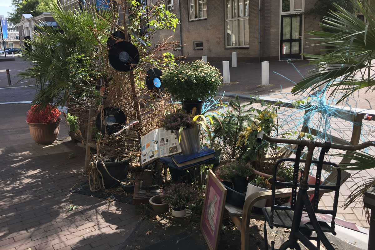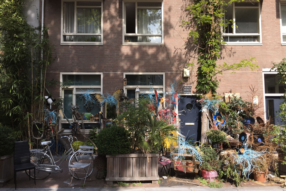 C’était en 2018. J’arrivais à Amsterdam et cherchais, dans le centre, un hôtel pour mes vacances quand soudain, comme tombé du ciel, apparut ce petit jardin insolite au pied d’un immeuble. Un bac de plantes, des bambous, des fleurs en pot, un sapin orné de vinyles. Plus loin, des anémones de mer en plastique turquoise, de vieux skis, des statuettes, un panda, un papillon géant, une tête en argile au bout d’un pieu, un pantin désarticulé aux yeux bandés…