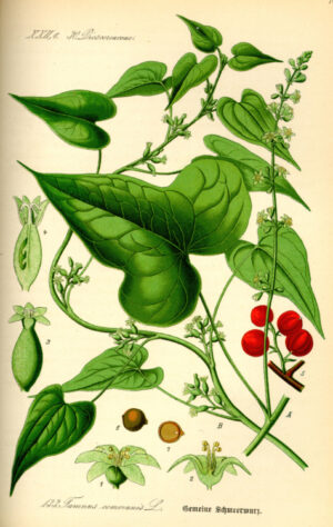 La racine de cette liane est connue depuis longtemps pour ses propriétés analgésiques et antiecchymotiques, ce qui lui a valu son surnom d’ « herbe aux femmes battues » (!). Râpée et cuite plusieurs heures, la racine finit par former une pâte qui fait disparaître les « bleus « . Il paraît que cette pâte mélangée à du saindoux soulage les rhumatismes. Quelques gouttes de vinaigre ajoutées à la racine cuite permettent de soulager les crises de goutte…