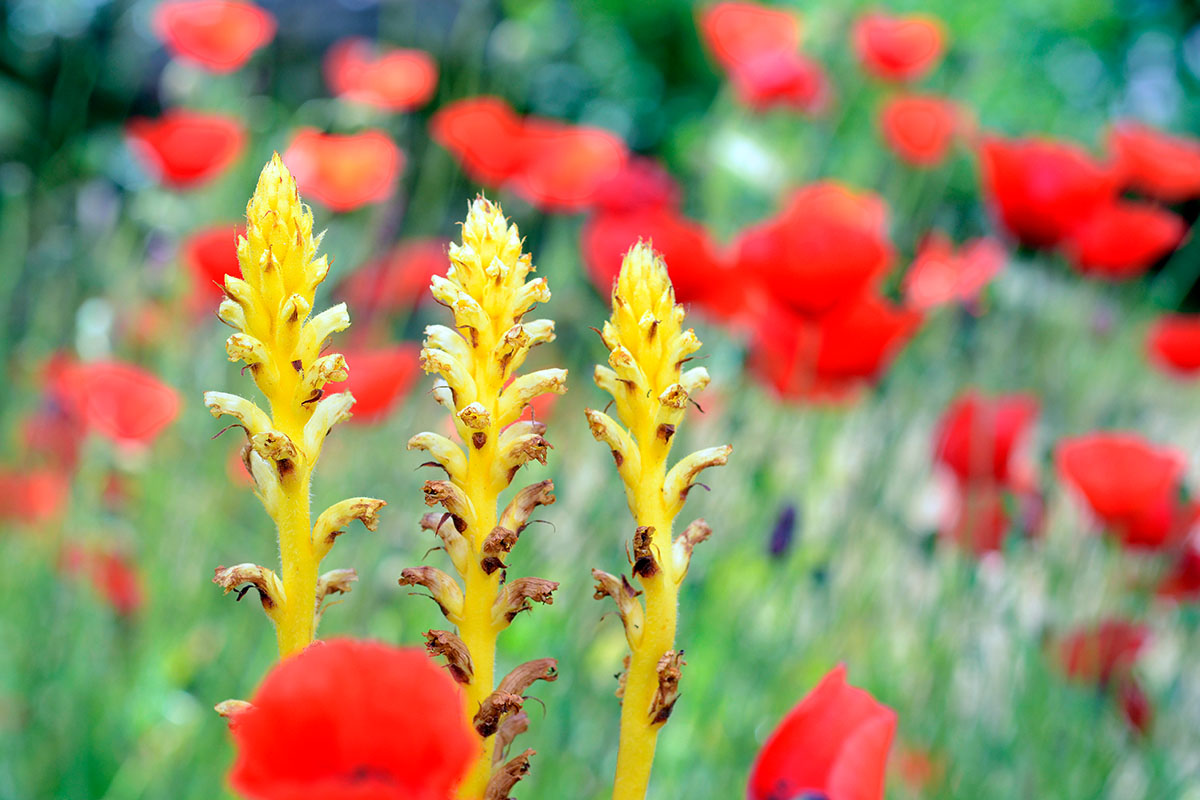 Orobanche jaune (O. lutea) : en fleur de juin à juillet. L’espèce s’attaque surtout aux luzernes.