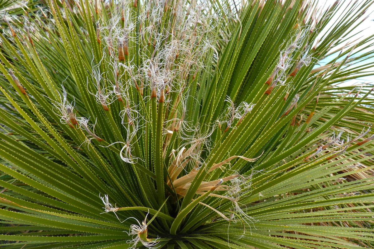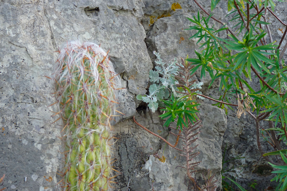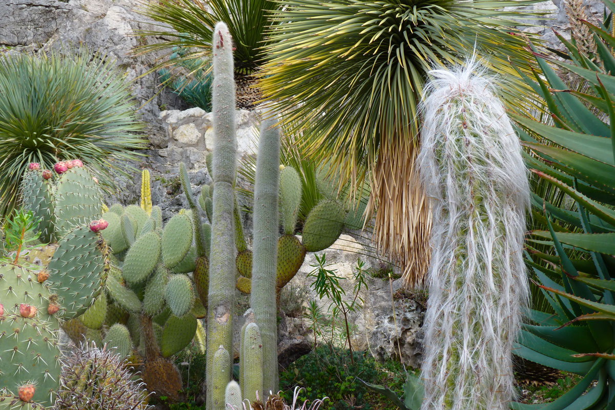 On a un très beau Dasylirion quadrangulatum. Des cactus tête-de-vieillard âgés (Cephalocereus senilis). Un joli petit érable du Japon. La plante la plus dangereuse est sans doute le cactus Opuntia tunicata, surtout si vos doigts se prennent dans ses épines !