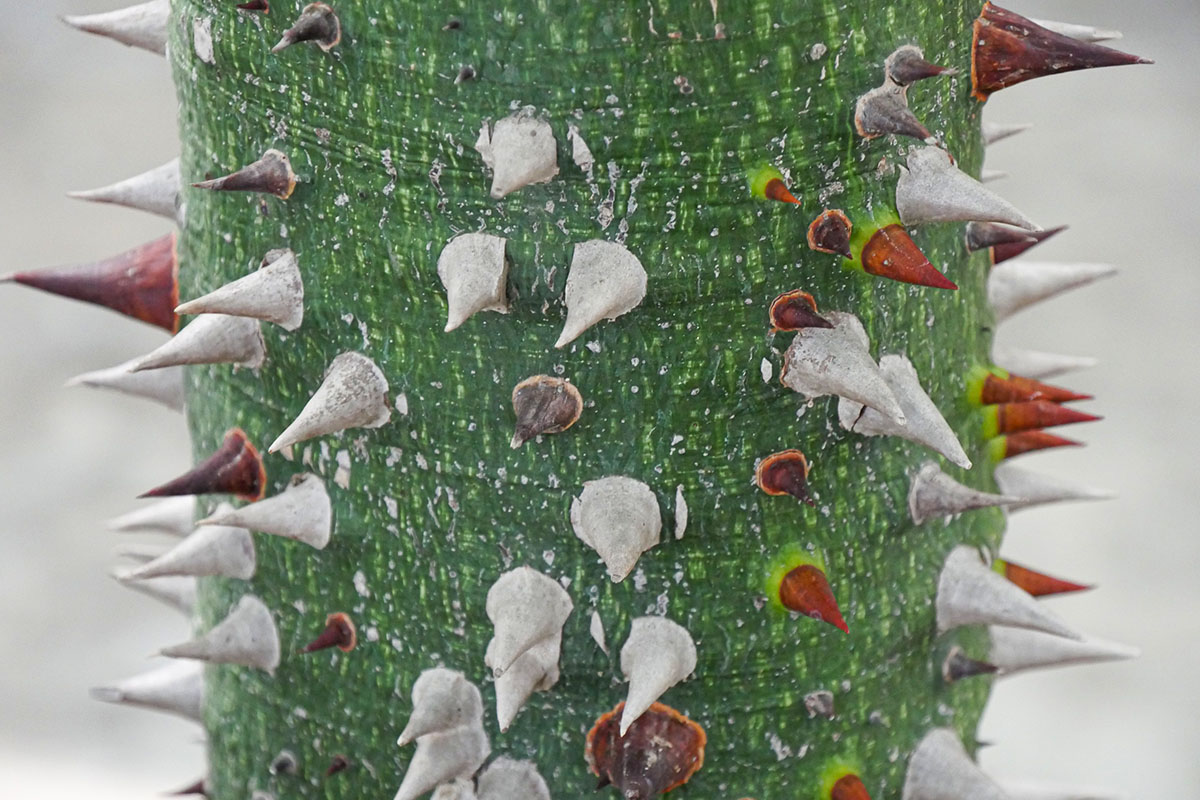 Pas franchement un arbre sur le tronc duquel s’appuyer pour faire la sieste… Ceiba speciosa (= Chorisia speciosa) originaire d’Amérique du Sud voit la couleur de son tronc changer avec l’âge. Jeune, l’écorce est verte. Elle se grise au fil du temps. Ce qui ne change pas, ce sont les centaines voire milliers d’épines coniques qui parsème le tronc. C’est un bel arbre d’ornement en régions chaudes, mais pas seulement. On utilise son bois pour faire de la pâte à papier, ses graines pour faire de l’huile et le coton contenu dans ses très gros fruits (environ 20 cm de diamètre) comme matière de rembourrage.
