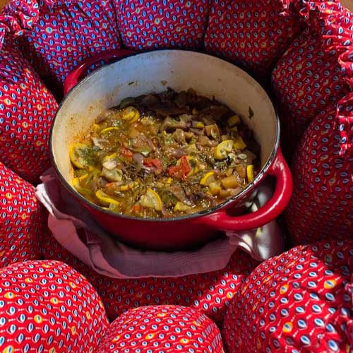Une fois la nourriture préchauffée, placez-la dans la marmite norvégienne. Les aliments continueront à cuire lentement dans la chaleur emprisonnée et à température constante. Une cuisson douce pendant plusieurs heures sans chaleur externe ! Utilisez-la pour les plats mijotés, les soupes, les ragoûts et les céréales !
