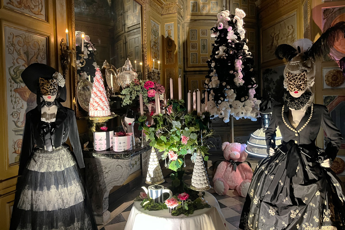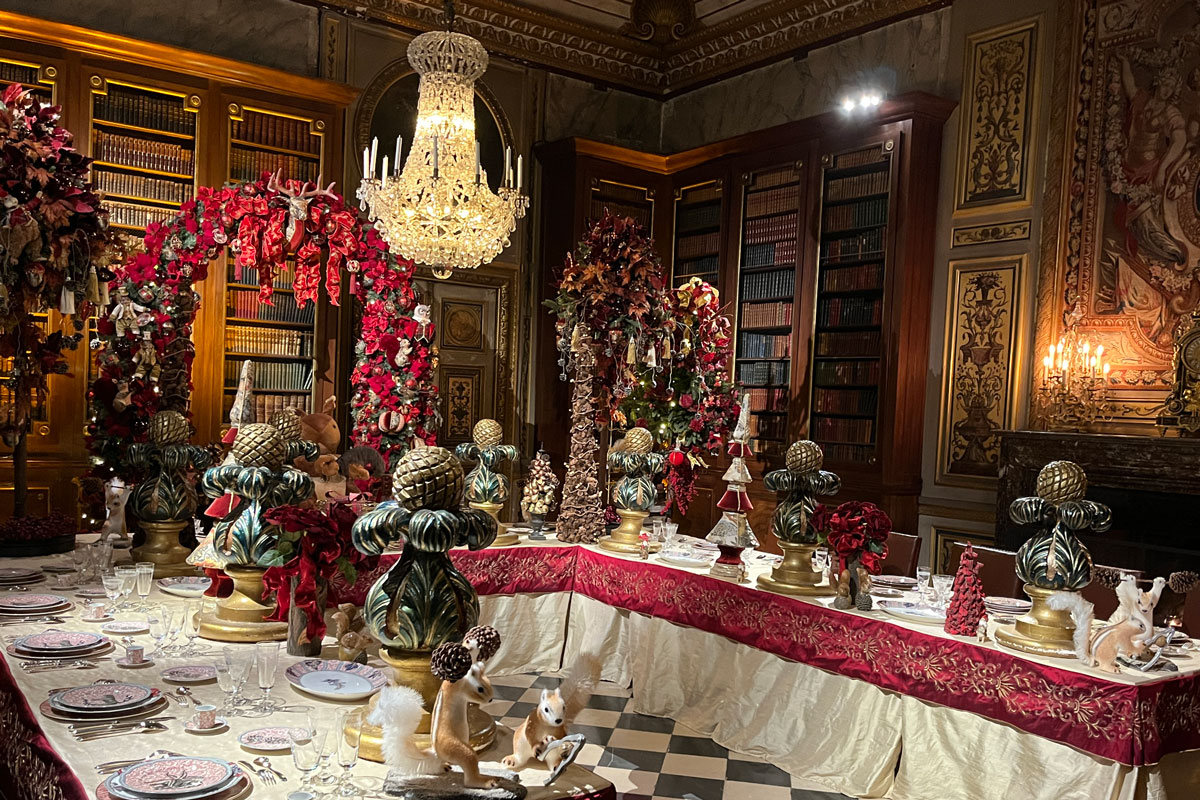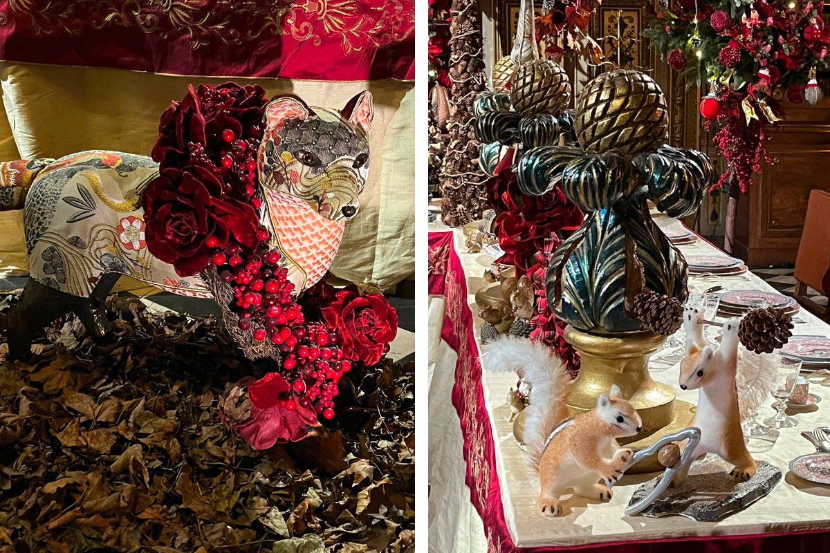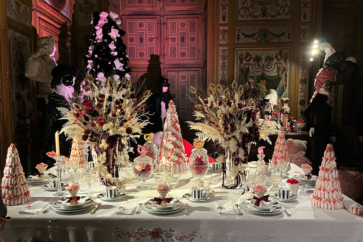 À l’intérieur du château, les décors sont plus grandioses encore. Les cascades de vaisselles, verreries et argenteries rivalisent avec les guirlandes, pièces montées et motifs en chocolat. Sans oublier dame Nature très présente à travers les bouquets, couronnes, sapins et décorations florales de toutes sortes. Pour ce Grand Noël, Chantal Thomas a ajouté sa touche personnelle. De même Nicolas Henry (NH Paris) qui a créé une série de « roses éternelles » à partir de roses anglaises blanches stabilisées à la colle selon une méthode très spéciale. Ces délicates fleurs à l’aspect givré ornent tous les ronds de serviette du banquet du Grand Salon.