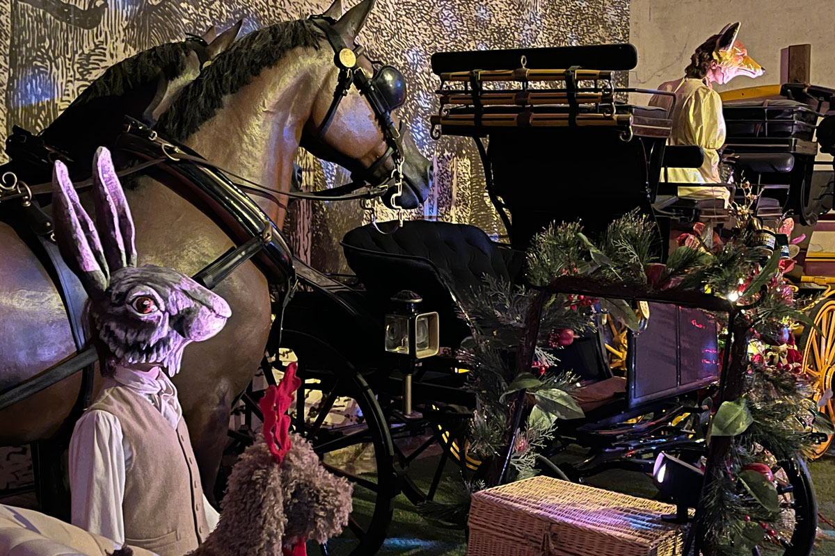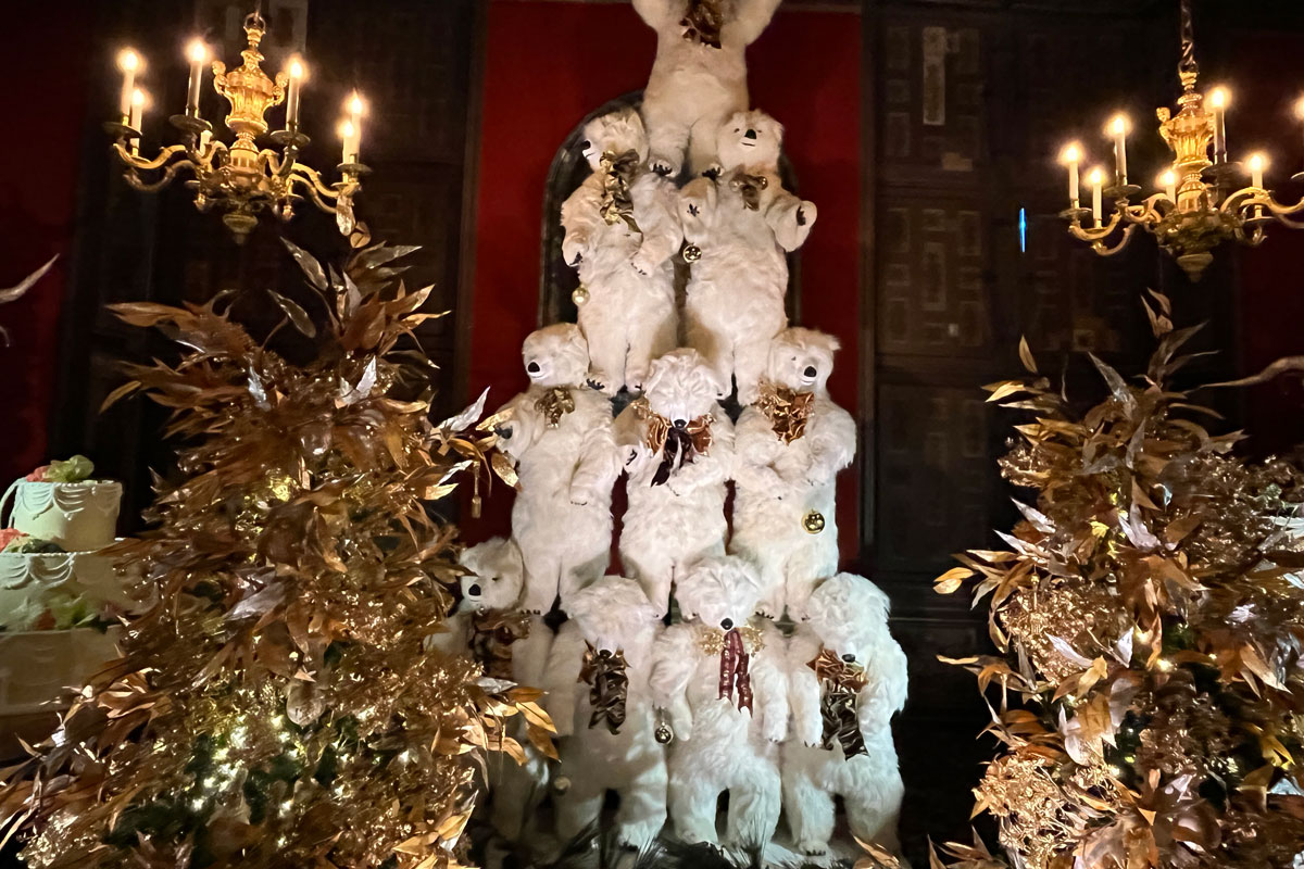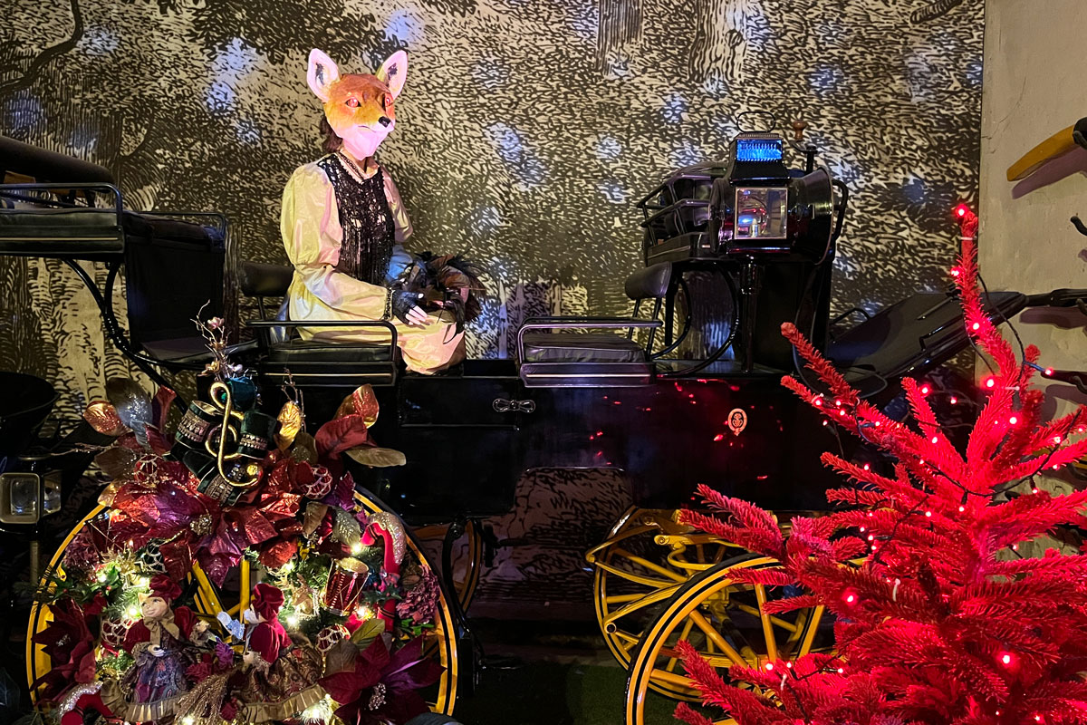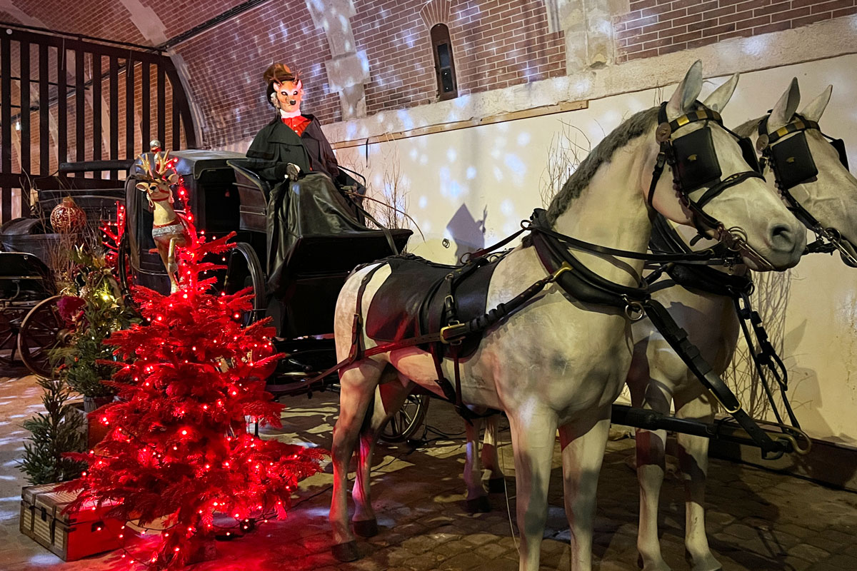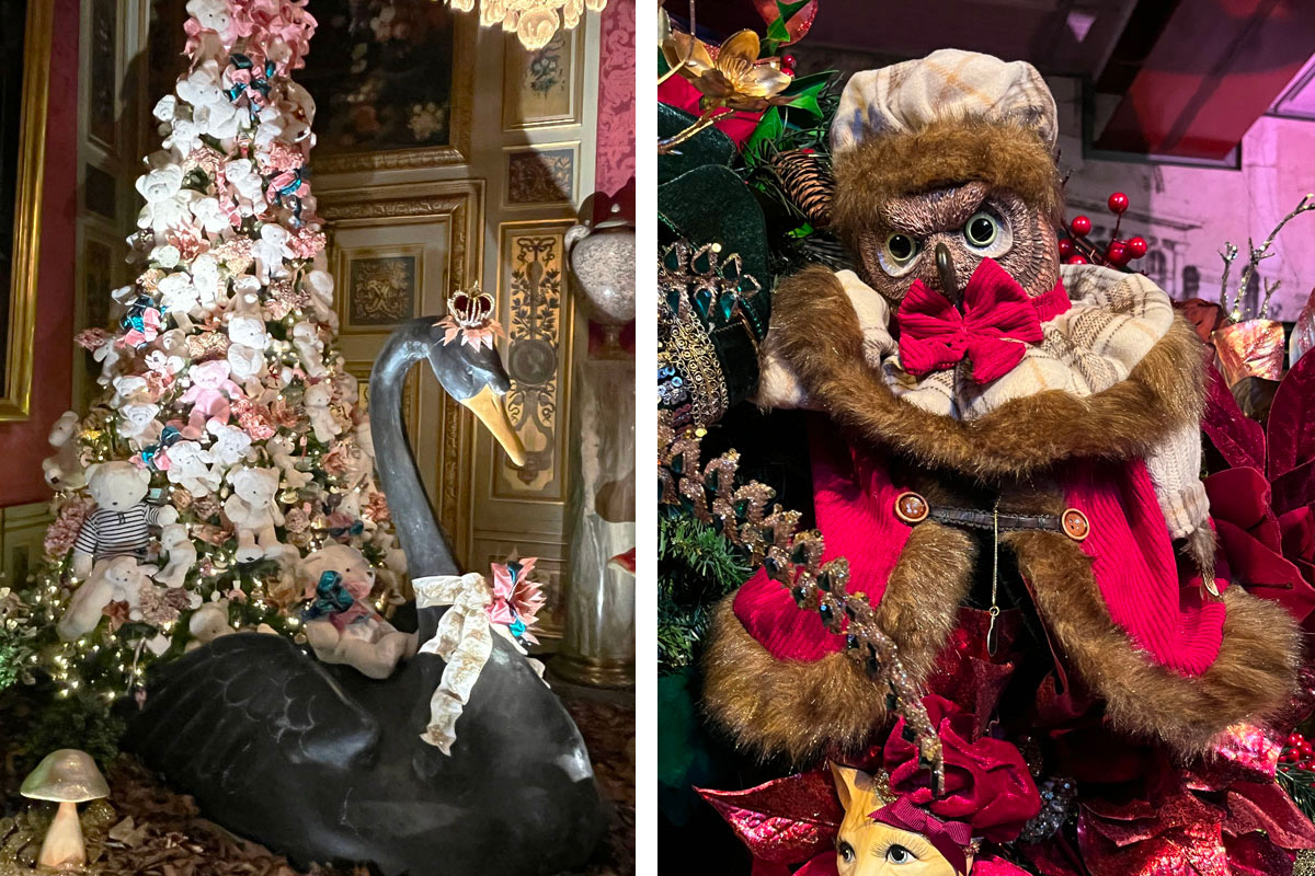 Enfin un peu partout sur les tables ou accrochés aux sapins, se sont glissés tous nos animaux préférés, peluches immobiles ou automates en mouvement : des oursons, des renards, des chouettes, des écureuils… De même, un cygne et des léopards. Un joyeux bestiaire qui envahit aussi le musée des Équipages et son Bal des Animaux (dans les anciennes écuries). De quoi ravir petits et grands !