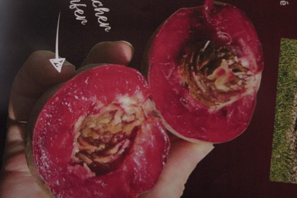 C’est un pêcher au fruit rouge sanguin créé par les Pépinières Ripoche. Ce croisement qui avait donné naissance à un arbre inédit cherchait son nom. La couleur trash du fruit, une pêche rouge sanguine juteuse et sucrée, a inspiré Alexandre Jahan et Luc-Olivier Ripoche.