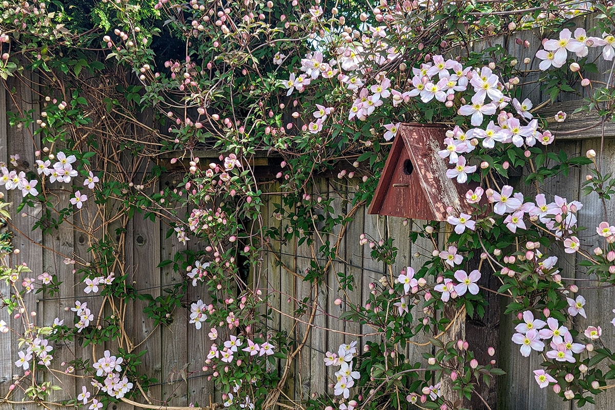 Quel bonheur en début de printemps quand la clématite des montagnes (Clematis montana) fleurit sur les grillages, les pergolas, les barrières, les murs, un arbre et parfois même les toits des abris de jardin. C’est une liane vigoureuse, généreuse dont on attend la floraison avec impatience !