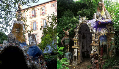 Tout au long de la ballade, vous trouverez des bibelots et des artefacts pour faire joli. Un bestiaire et des personnages imaginés par l’artiste lui-même. Et même une grotte-chapelle en mosaïques géantes et des fresques. L’ensemble réalisé avec des morceaux d’assiettes cassées, des miroirs, des coquillages, des bijoux, des verres colorés et autres objets de récupération…