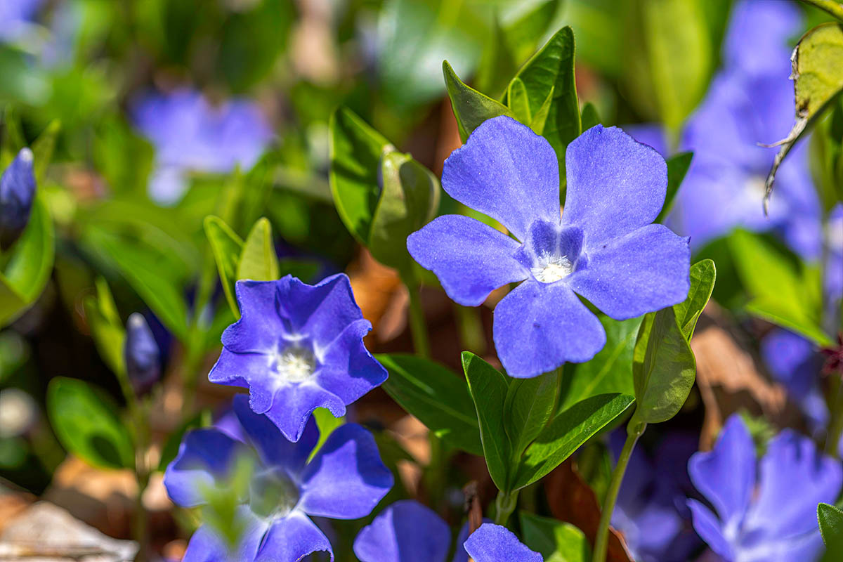 Mettez quelques pieds à l’ombre d’arbustes ou pour créer du lien dans un massif de vivaces ombragé ou mi-ombragé. Et observez ! La grande pervenche lance rapidement ses tiges à l’assaut du terrain. Un tempérament conquérant qui lui permet de former au bout de quelques années un tapis assez dense. Ses tiges s’enracinent en effet rapidement au contact du sol. Grâce à ce pouvoir « magique », Vinca major est ainsi capable de crapahuter même sur des talus ou des endroits pas faciles à planter. Dernier atout : sa densité de végétation gêne les adventices aux tournures, elles ont du mal à s’y faire une place.