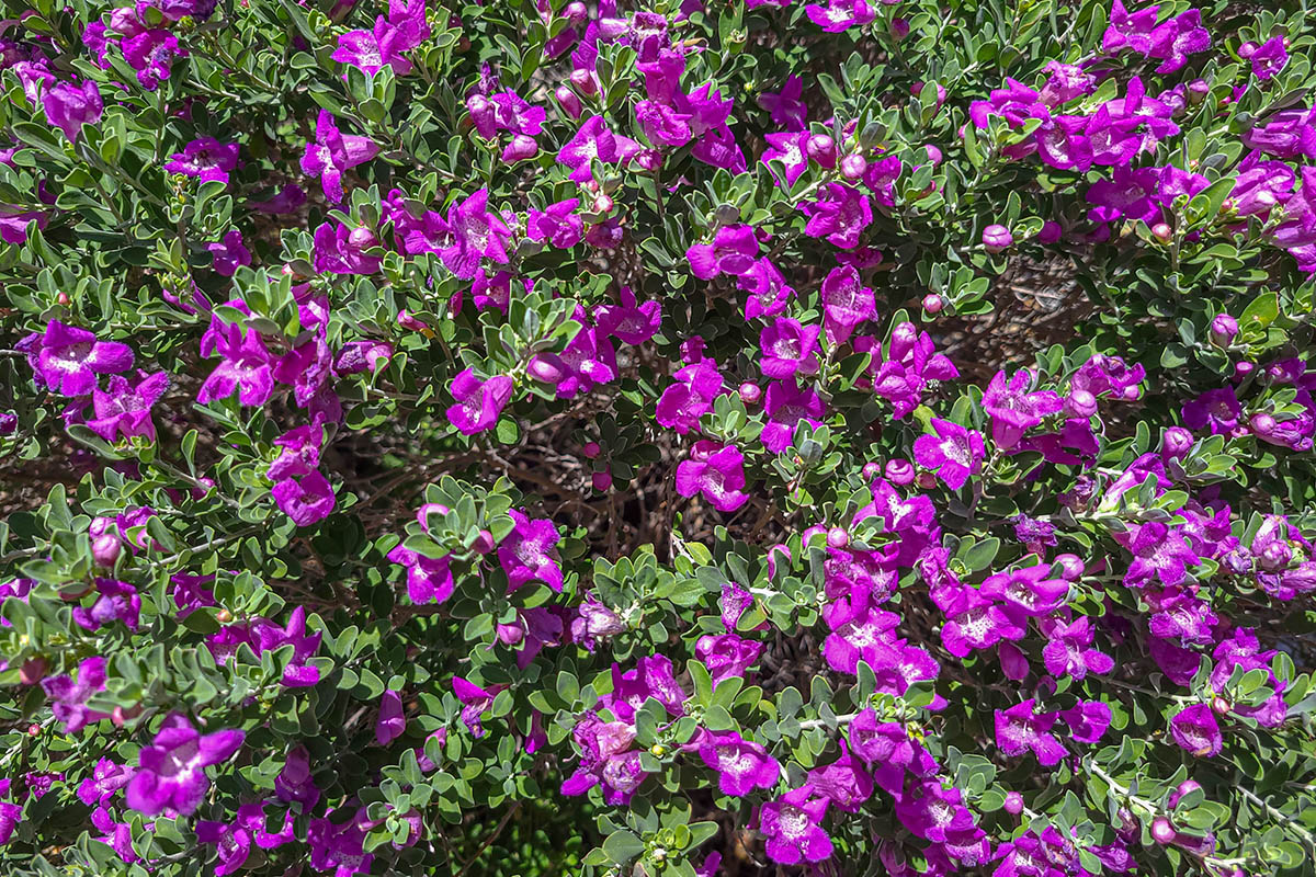 C’est un habitué des longs étés chauds et très secs. Leucophyllum frutescens, surnommé à raison la sauge du désert, attend les pluies de fin d’été, début d’automne pour -enfin- fleurir en abondance. Vous pouvez le cultiver en pleine terre dans les zones douces et en pot ailleurs.