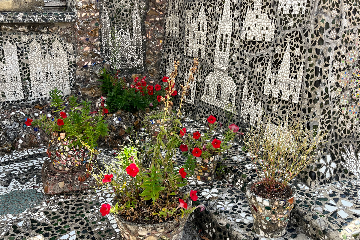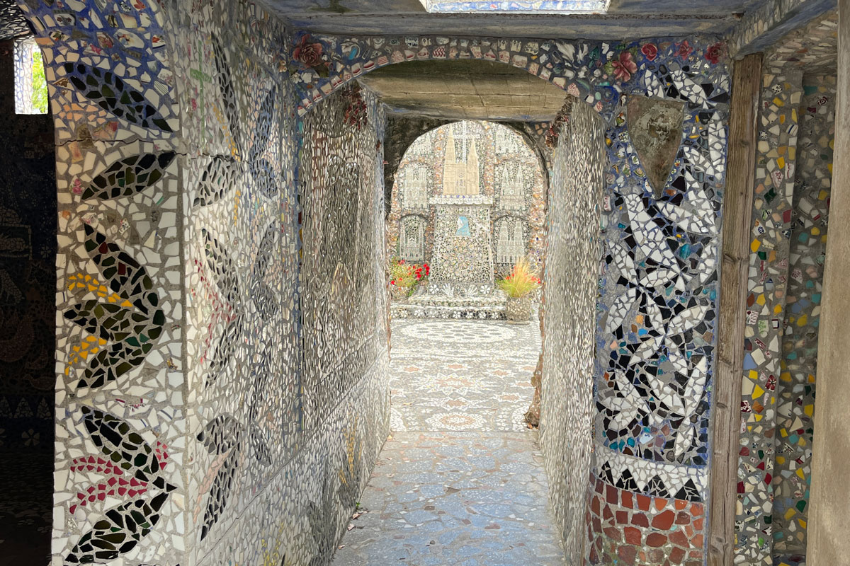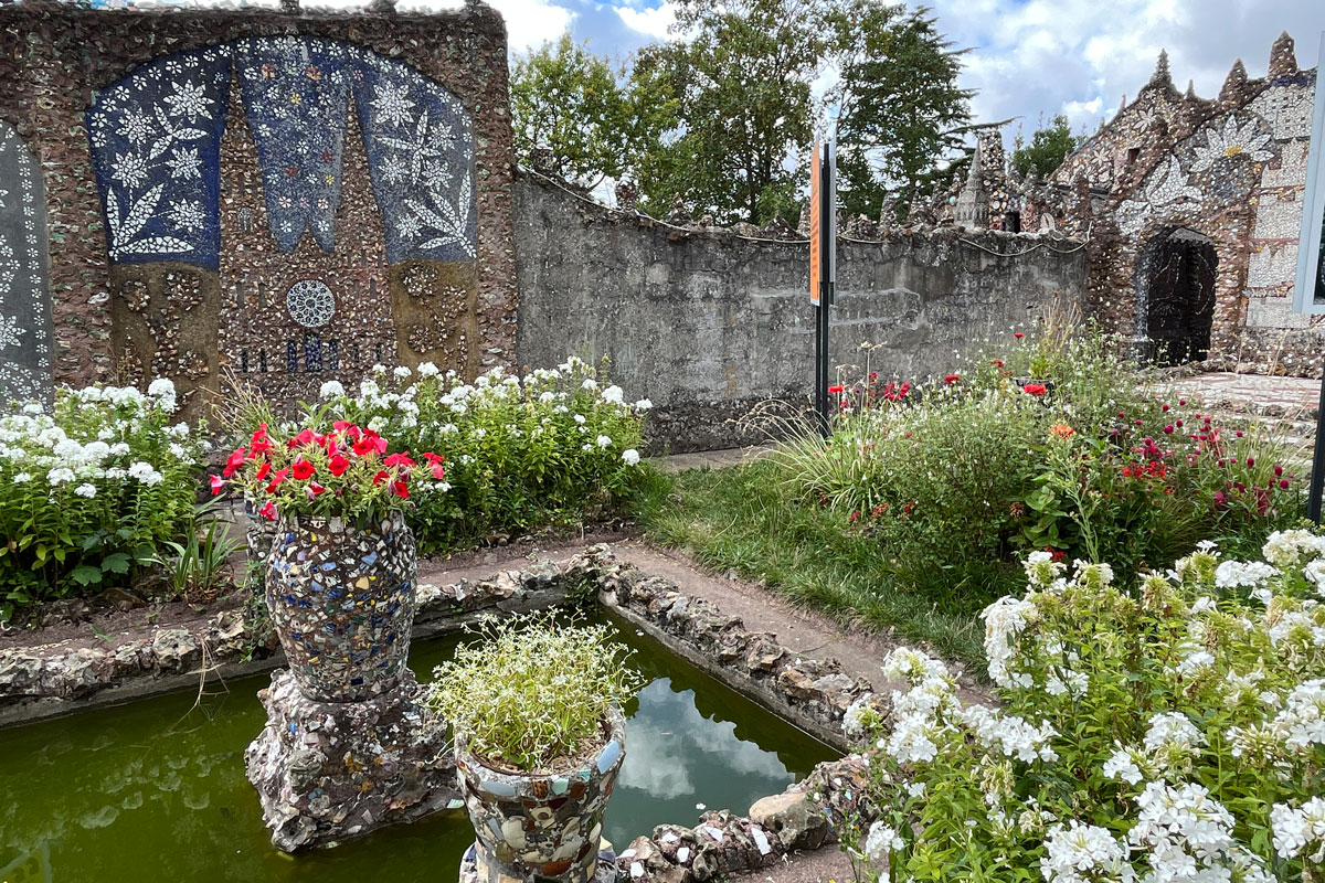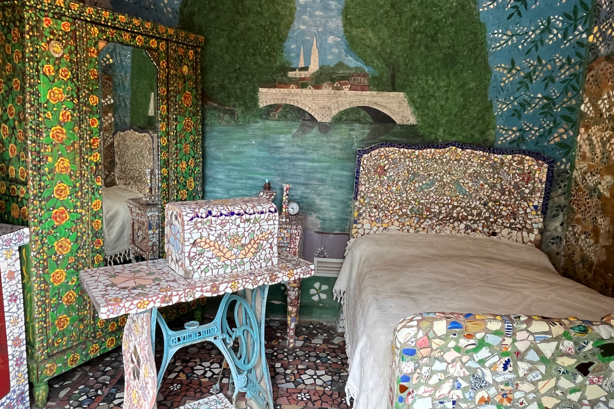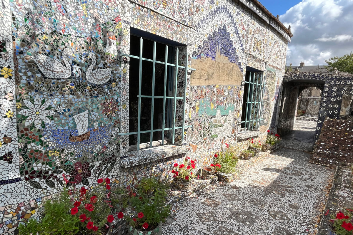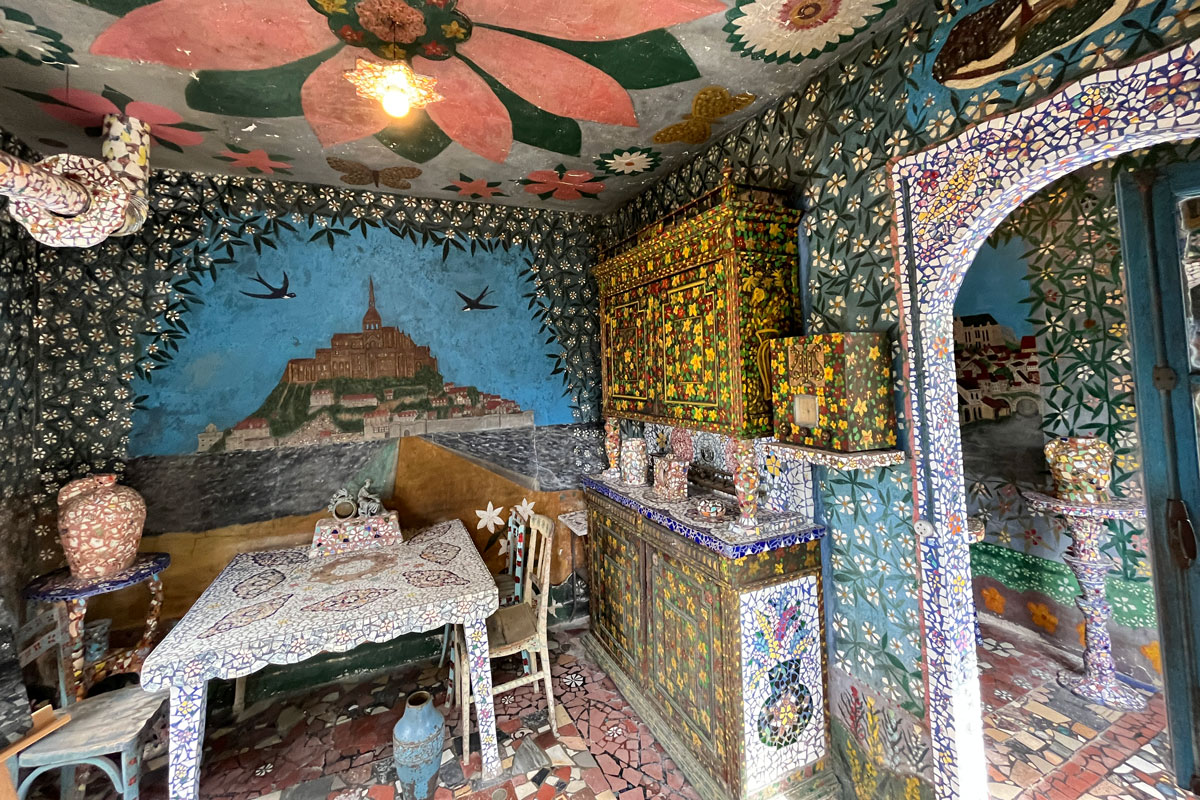 Au début, pour honorer Adrienne, sa femme, ce sont des centaines de fleurs blanches et jaunes, narcisses ou pervenches, qui entre autres motifs envahissent la cuisine, du sol au plafond. Poêle, table et vaisselier compris. Un goût pour la peinture et la mosaïque qui ne devait bientôt plus connaître de limite. Ces débris de verre ou de céramiques glanés dans les champs ou les décharges donneront naissance à tout un univers d’architectures, de personnages mystiques un peu mystérieux qui peuplent tour à tour la chambre, le jardin d’hiver, la chapelle, la Cour noire, la grotte… « Un labeur de 29 000 heures pour lequel il manipula 4 millions de débris de vaisselle, soit 15 tonnes » témoigne la veuve de Raymond après sa mort.