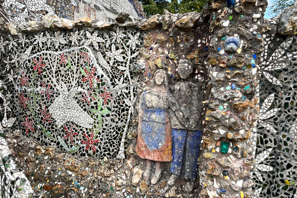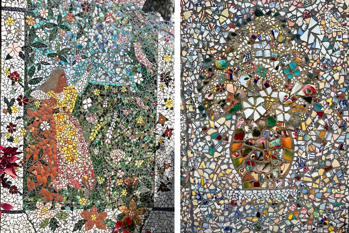Raymond et Adrienne affectionnaient les plantes et les animaux que l’on retrouve à de nombreuses reprises dans les mosaïques : corolles, vases de fleurs, papillons, hirondelles, cygnes, cerfs, chevreuils, ânes, brebis, lapins… Comme le poêle et la machine à coudre qui connurent un destin mosaïqué, l’entrée de la maison s’orne d’un petit arrosoir et d’une mini-brouette en ciment et éclats d’assiettes. Tandis que plus loin, une charmeuse d’oiseaux lève le bras vers une petite créature à plumes.