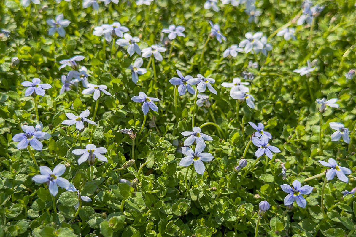 Ce n’est pas une plante à laquelle on pense de suite pour cette utilisation. Et pourtant, Pratia pedunculata (syn : Isotoma fluviatilis) réussit parfaitement en couvre-sol. Le feuillage est vert vif, les tiges bien ramifiées se marcottent toutes seules comme des grandes. Cette plante d’origine australienne et néo-zélandaise offre de plus une longue floraison. Selon les variétés, les fleurs sont blanches (‘Alba’), bleu pâle ou bleu soutenu (‘County Park’).