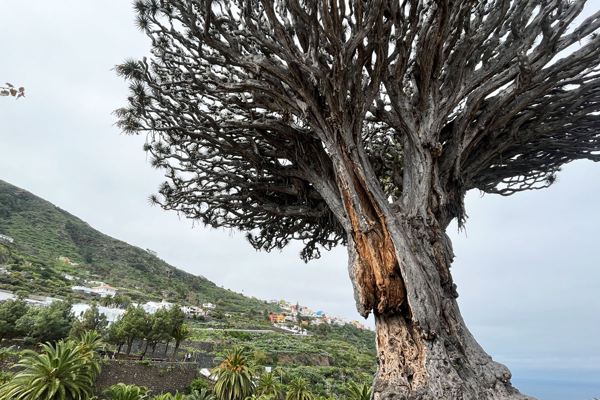 C’est dans ce village au drôle de nom, au nord de Tenerife, qu’il est né il y a 1000 ans, 2000, selon certains. 16 mètres de haut, une base de 20 mètres de circonférence, 80 tonnes… Ce dragonnier est considéré comme le plus grand et le plus vieux de tous les spécimens vivants aux Canaries. Voire en Macaronésie.